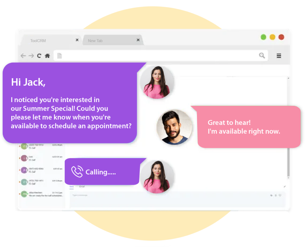 ToolCRM lets you connect with your leads via phone calls, voicemail drops, SMS/MMS, emails, and even Facebook Messenger.